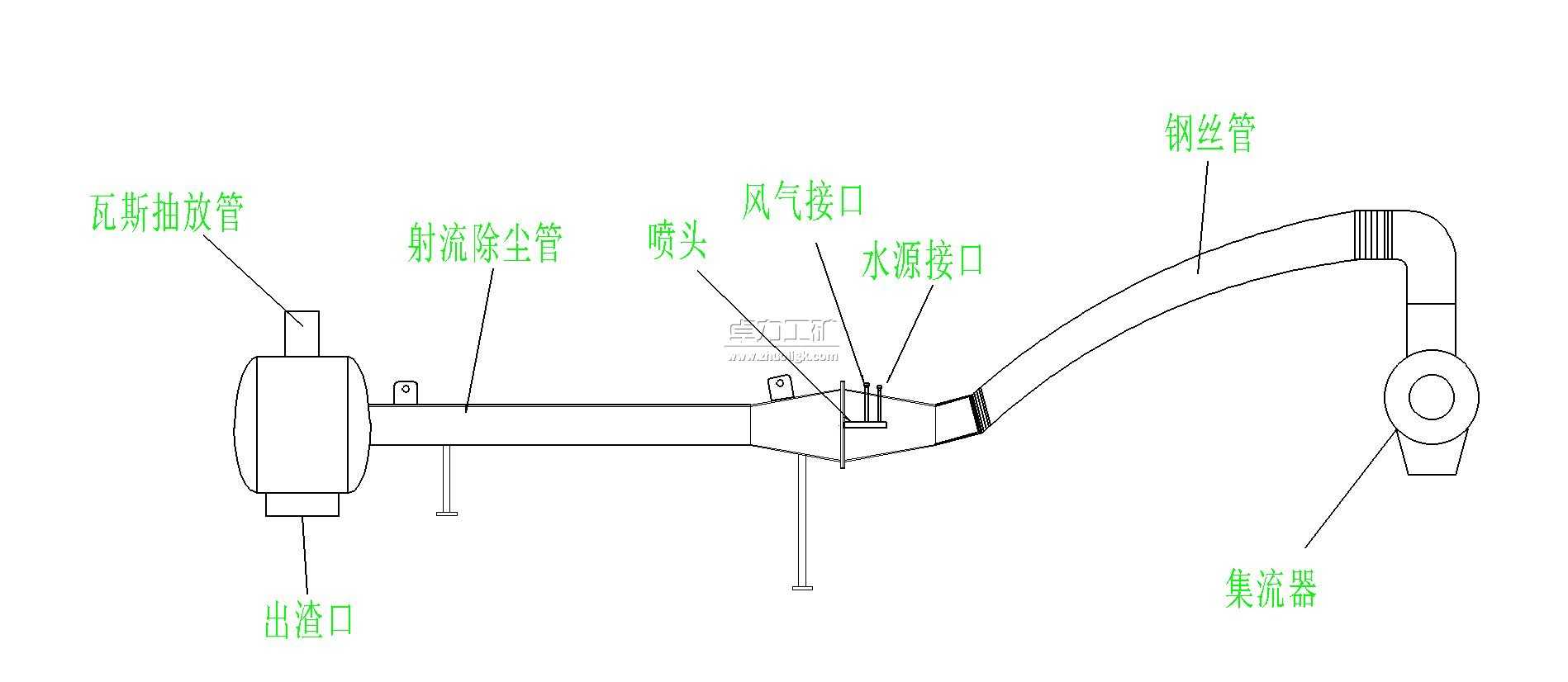 降塵裝置主要由射流除塵管、射流盤、波紋管、集塵器、水氣噴頭等構(gòu)成。降塵裝置采用噴霧引射流形成的負(fù)壓直接將鉆孔煤塵由集塵器吸入引射除塵管,與水霧混合后使煤塵沉降在引射除塵管的內(nèi)壁,而后被水沖出從而達(dá)到除塵的目的。