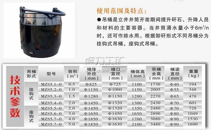 使用范圍及特點(diǎn):吊桶是立井井筒開鑿期間提升矸石、升降人員和材料的主要容器。當(dāng)井筒涌水量小于6M3/h時(shí),還可作排水用。