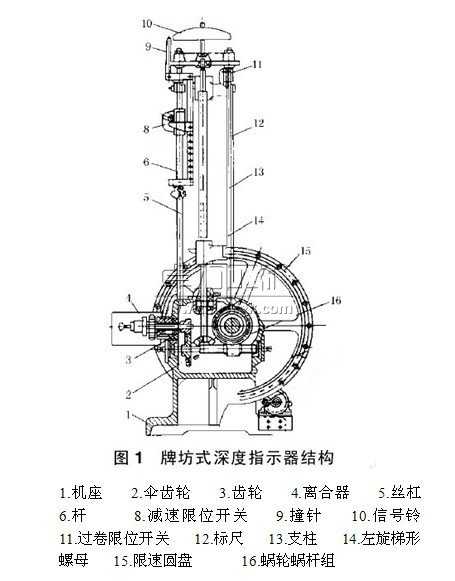 牌坊式深度指示器為數(shù)字式深度指示器,司機可以很直觀的了解容器的位置。牌坊式深度指示器的運動是通過兩個鏈輪和套筒滾子鏈傳的。深度指示器結(jié)構(gòu)簡單,指示可靠。另外還可以根據(jù)用戶井筒深淺,更換從動鏈輪的大小,以改變指針的運動距離,給司機以清楚醒目的指示。