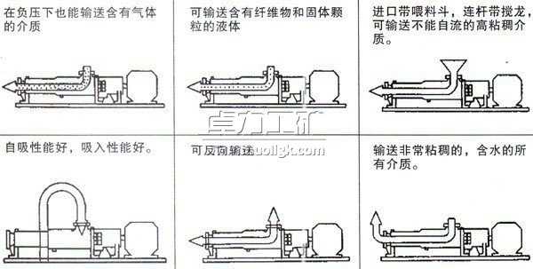 因定子選用多種彈性材料制成,所以這種泵對高粘度流體的輸送和含有硬質懸浮顆粒介質或含有纖維介質的輸送,有一般泵種所不能勝任的特點。其流量與轉速成正比。