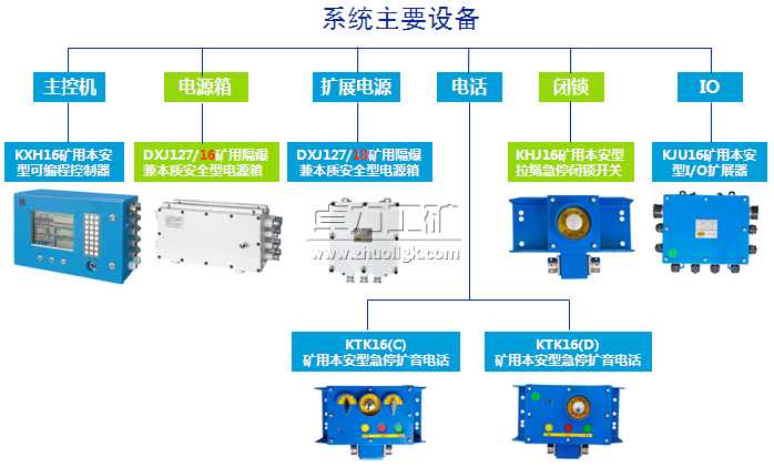裝置由KXH16礦用本安型可編程控制器、DXJ127/16礦用隔爆兼本質(zhì)安全型電源箱、DXJ127/18礦用隔爆兼本安型電源箱、KJU16礦用本安型I/O擴(kuò)展器、JXJ0.05/127礦用隔爆兼本質(zhì)安全型變換箱、KHJ16礦用本安型急停閉鎖開關(guān)、KTK16(C)礦用本安型急停擴(kuò)音電話、KTK16(D)礦用本安型急停擴(kuò)音電話、電纜等組成,其中KXH16礦用本安型可編程控制器為系統(tǒng)核心部分。