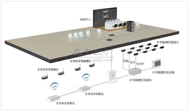 視頻監(jiān)控系統(tǒng)集煤礦移動視頻監(jiān)視裝置ZYSJ127和煤礦視頻監(jiān)視裝置ZSJ127于一身,我公司同時開發(fā)了有線固定監(jiān)視設備與無線移動監(jiān)視設備。視頻監(jiān)控系統(tǒng)由礦用隔爆兼本安型計算機、礦用本安攝像儀、本安型基站(WIFI基站)、移動監(jiān)視終端、礦用隔爆型攝像儀、礦用隔爆型錄像機、礦用隔爆型顯示器、防爆充電器等組成,用來以視頻形式監(jiān)測井下設備的工作狀態(tài),并集合存儲和顯示功能。此系統(tǒng)的投入可以提高工作效率,增強工作設備的安全性和可靠性。最終為設備的“無人值守”提供視頻依據。視頻系統(tǒng)以綜合管理軟件為核心,實現(xiàn)了基于網絡的點對點、點對多點、多點對多點的遠程實時現(xiàn)場監(jiān)視、遠程遙控攝像機以及錄像、報警處理等,通過兼容有線和無線視頻設備實現(xiàn)視頻系統(tǒng)的數字化統(tǒng)一管理。系統(tǒng)配置圖