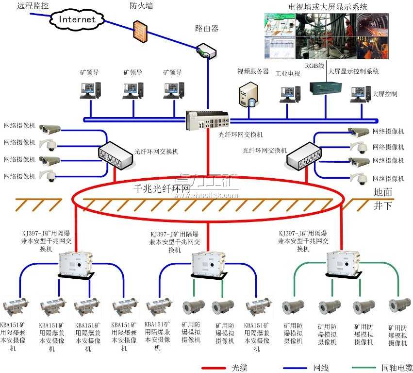 工業(yè)電視監(jiān)控系統(tǒng)以地面千兆光纖環(huán)網(wǎng)交換機和井下KJ397-J礦用隔爆兼本安型千兆網(wǎng)交換機為核心,組成地面與井下一體的千兆光纖環(huán)網(wǎng),每個交換機上有多個100M以太網(wǎng)電口,網(wǎng)絡(luò)攝像機可以通過網(wǎng)線直接接入交換機,由光纖環(huán)網(wǎng)傳輸?shù)降孛姹O(jiān)控中心。此外,礦用交換機內(nèi)部設(shè)有視頻服務(wù)器,井下模擬攝像機可以直接通過同軸電纜接入。