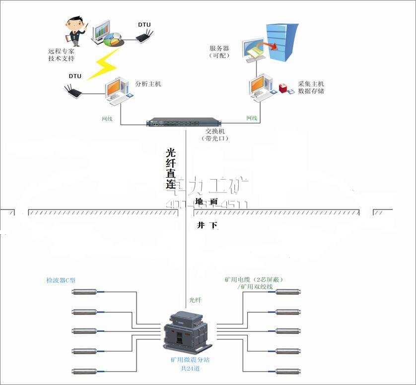 礦用微震系統(tǒng)由采集主機(jī)(服務(wù)器)、分析主機(jī)、交換機(jī)、信號傳輸設(shè)備(電轉(zhuǎn)光口設(shè)備、光纜、電纜、接線盒)、KJ699礦用微震監(jiān)測分站、拾震器GZC4.5A、環(huán)網(wǎng)交換機(jī)(地面交換機(jī))、UPS電源、服務(wù)器等組成。