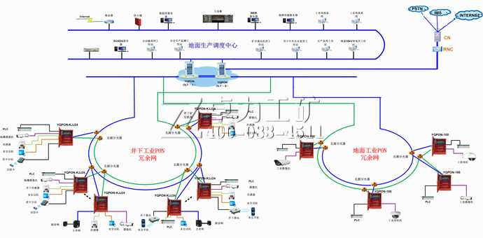 目工業(yè)PON環(huán)網(wǎng)系統(tǒng)為礦用環(huán)境直接提供以太網(wǎng)、POTS、CAN 、RS485和BNC等接口的子系統(tǒng)的信息接入,實現(xiàn)維護圖形化、遠程化、并且對全網(wǎng)重要設備實現(xiàn)備份,從而降低維護的難度提高了系統(tǒng)的安全性。該系使用硬件切換技術,可保證冗余鏈路切換時間<2ms,系統(tǒng)快速自愈,不會丟失系統(tǒng)數(shù)據(jù)。該系統(tǒng)代表了礦用信息通信領域最線前沿的技術方向。同事該系統(tǒng)在同一傳輸網(wǎng)絡平臺和軟件平臺的基礎上,將最新傳輸技術應用在生產(chǎn)、管理調(diào)度、監(jiān)控檢測等各個環(huán)節(jié),進而完善、改進和整合現(xiàn)有井下各個系統(tǒng)的同時,實現(xiàn)了煤礦的安全、生產(chǎn)、經(jīng)營和管理等信息集成。拓撲圖