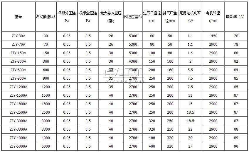 三、ZJY系列帶溢流閥羅茨真空泵主要技術(shù)性能指標(biāo)(見下表)