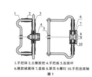 1.手把體 2.主橡膠把 4.手把座 5.連接環(huán) 6.橡膠減震體 7.蓋板 8.罩殼 9.螺釘 10.手把連接軸
